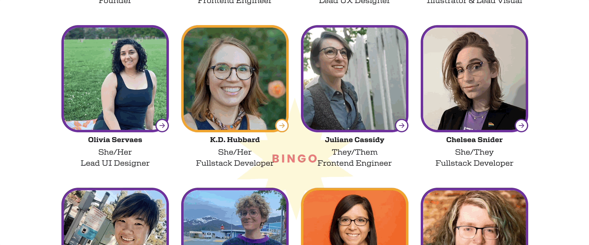 With this concept, the user would be able to click on the contributor’s image to access more information about them. Shapes were to be included to make the page look more like a bingo board.