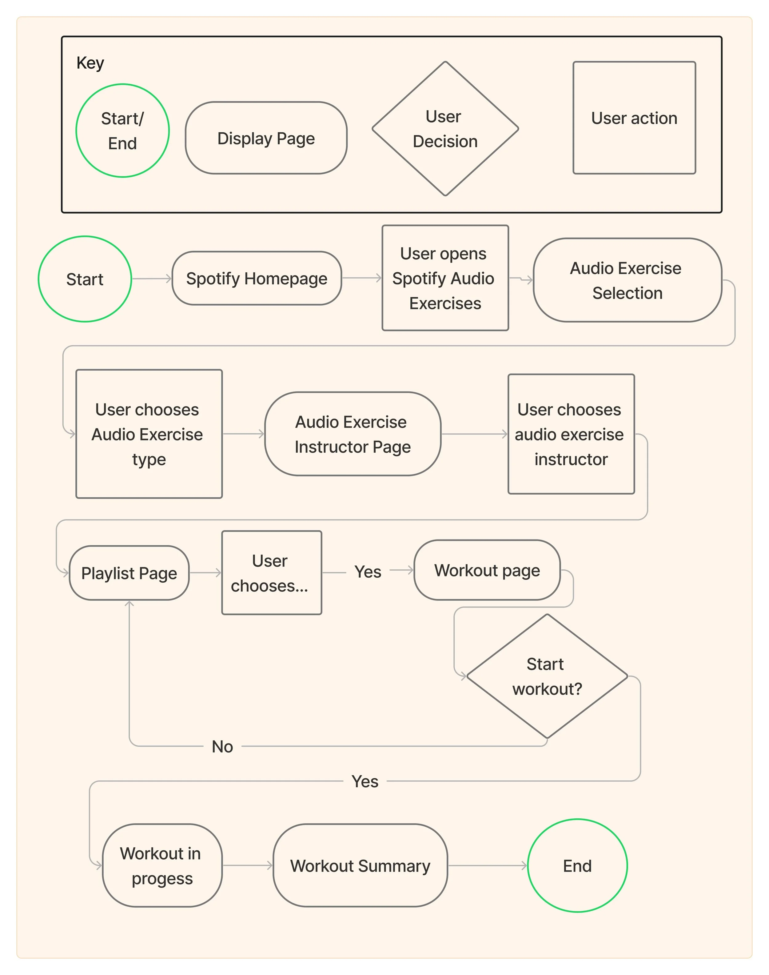 By mapping out the user flow, the design process prioritizes user-centricity, ensuring a smooth and intuitive experience for Spotify users integrating fitness into their music streaming routine.