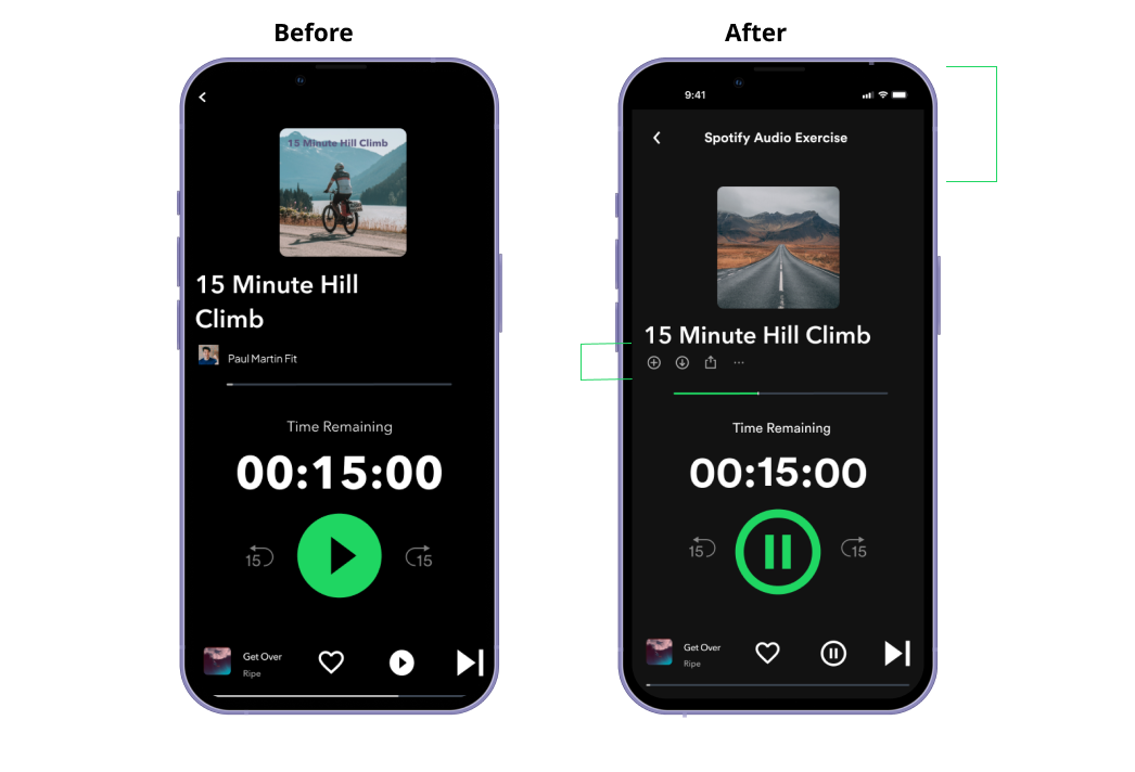 Though it was one of my biggest challenges, I feel integrating Spotify Audio Exercises with the existing Spotify UI was my greatest success. This accomplishment was particularly evident in the "Browsing Audio Exercises" page, where the seamless blend of the new element with the established design was a pride point.